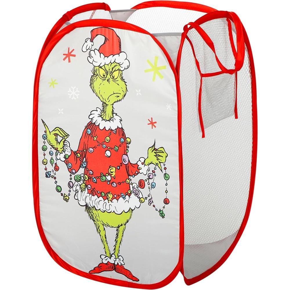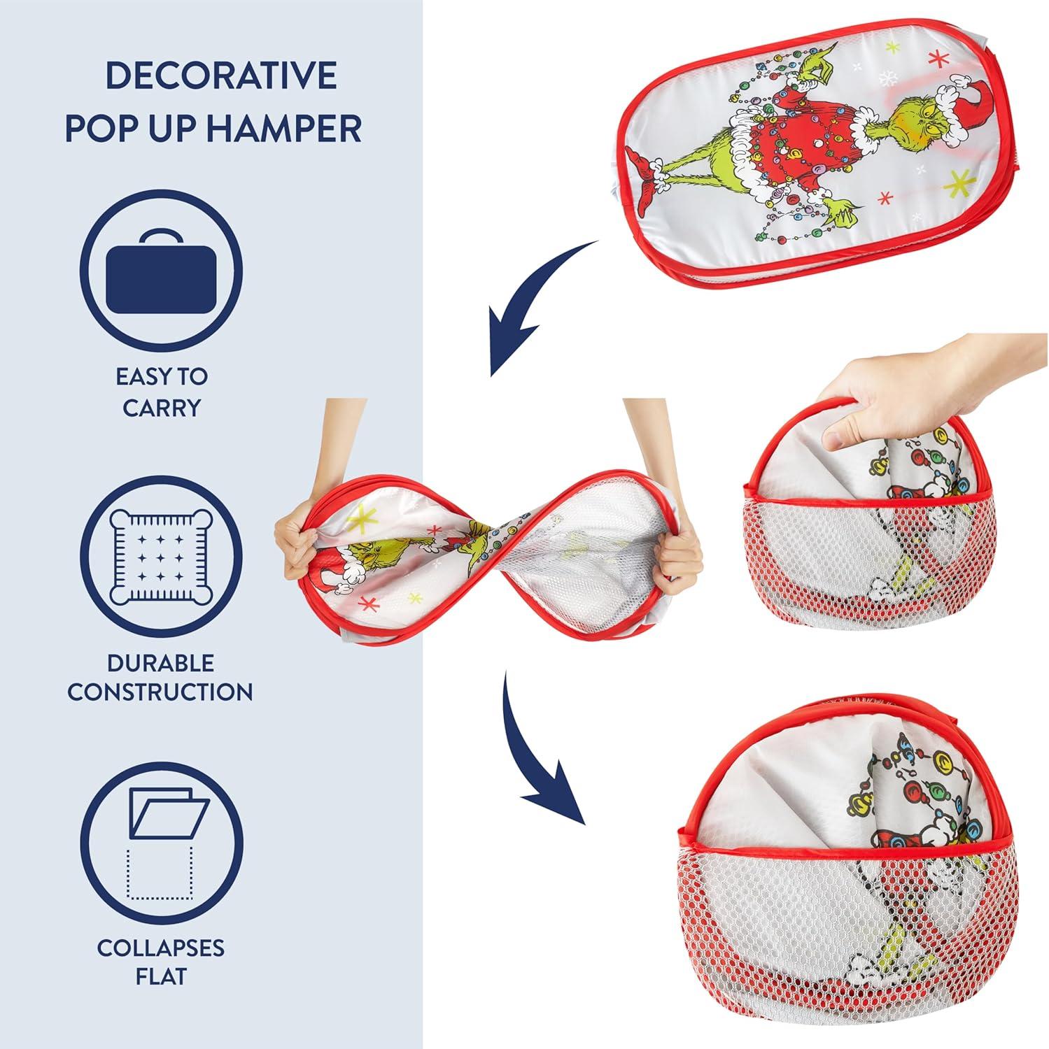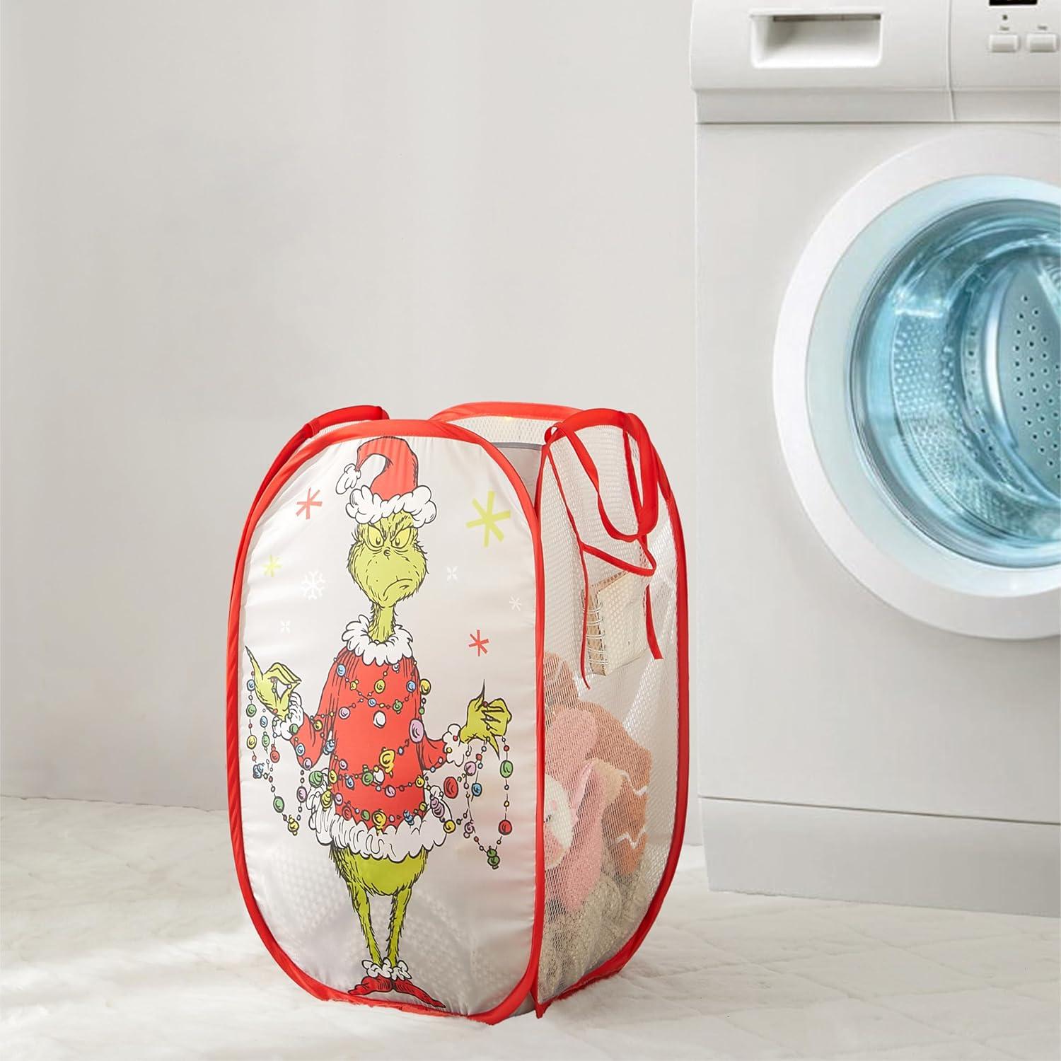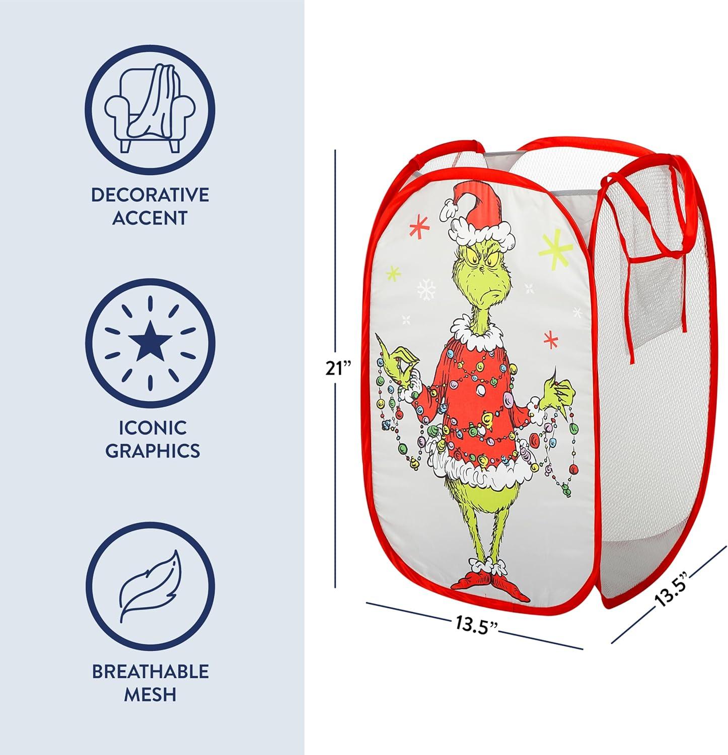 OFFICIAL LICENSED DESIGN: Featuring the iconic Grinch dressed in his festive red Santa outfit, this pop-up hamper brings a touch of holiday mischief and charm to any room. The vibrant design captures the classic Dr. Seuss character holding colorful Christmas lights,perfect for fans of How the Grinch Stole Christmas!