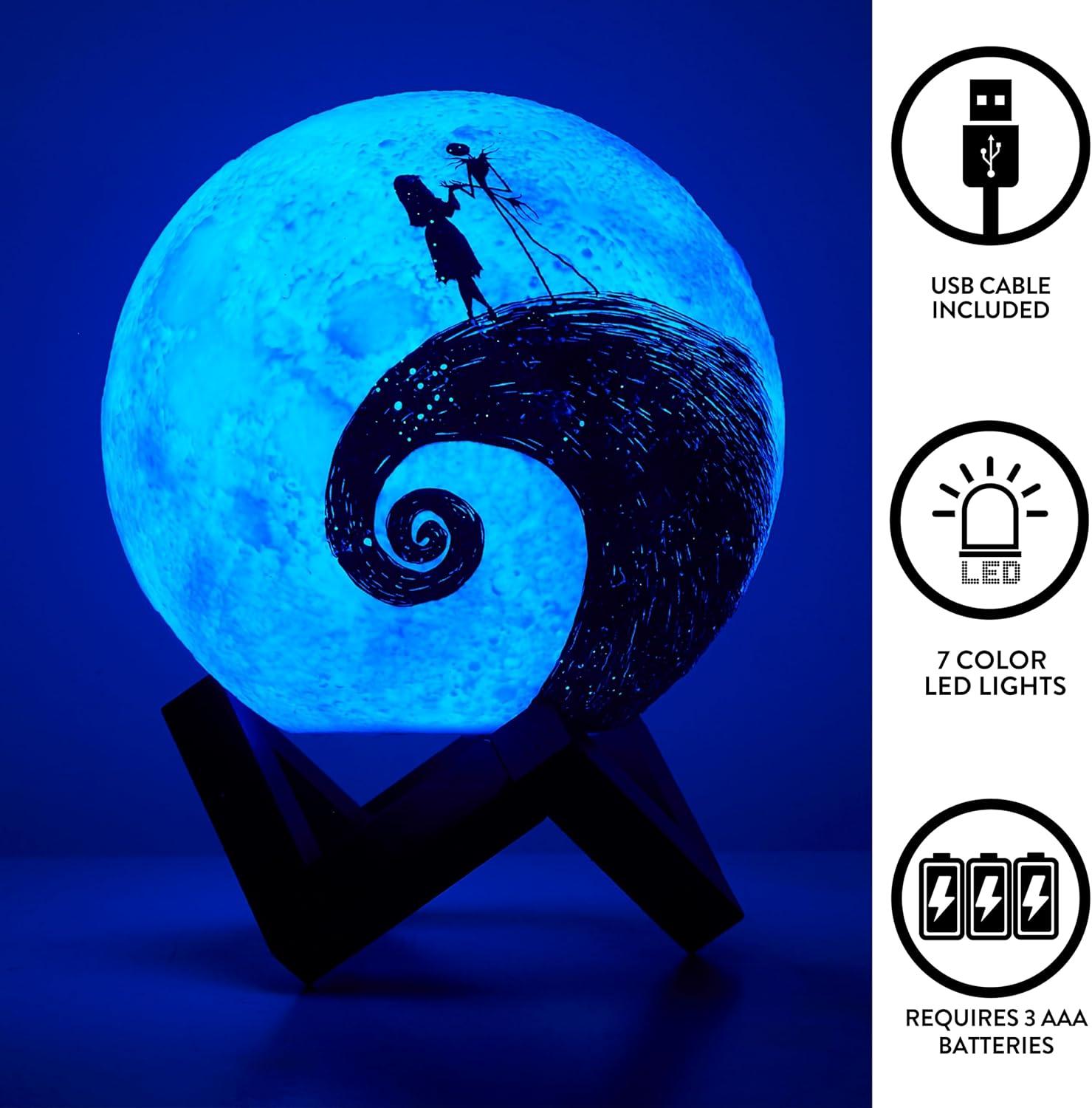 NIGHTMARE BEFORE CHRISTMAS DESIGN: With a figural Moon design, Jack Skellington and Sally appear as silhouette graphics on the front of this Mood light. Perfect for all Tim Burton The Nightmare Before Christmas fans or for adding a seasonal touch.