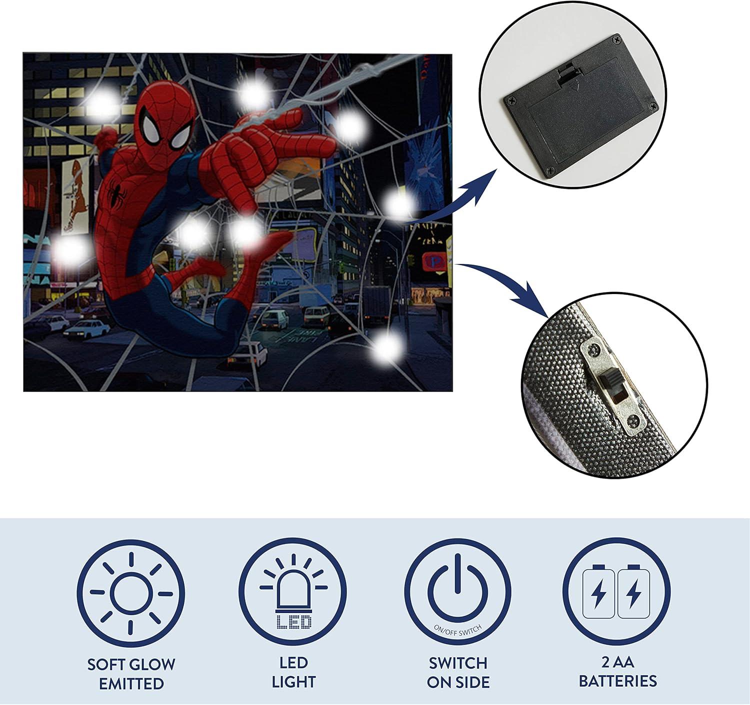 Hang the Spider-Man LED Canvas Wall Art in your child's bedroom to display a colorful print of your child's favorite masked superhero. The LED Lights will light up your child's room to create a beautiful illusion on the artwork. The lights emit a soft glow that can also be used as a night light. 2-AA batteries required – not included. Size: 15.75″ W X 11.5″ H.