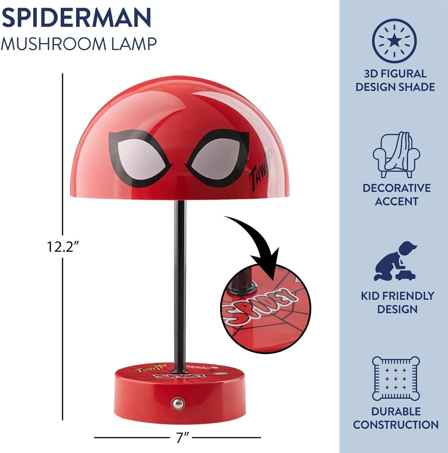 OFFICAL LICENSED DESIGN: The Spiderman lamp features a charming mushroom-shaped shade adorned with a dynamic Spider‑Man graphic, making it a playful and vibrant accent for any room.