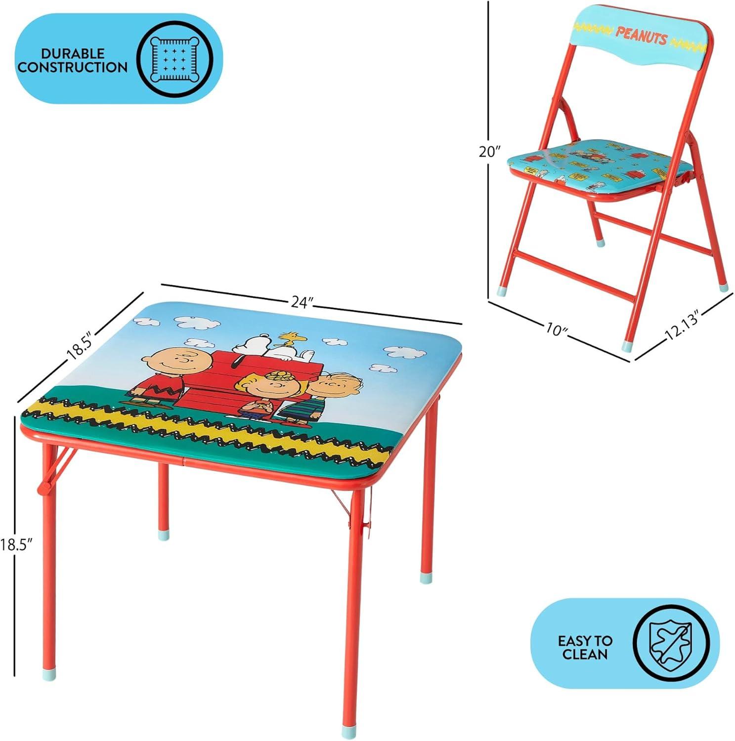 OFFICIAL LICENSED DESIGN: This kids' table and chair set features beloved Peanuts characters including Charlie Brown, Snoopy, Woodstock, and friends. The vibrant artwork and iconic red doghouse scene are printed directly on the tabletop and seatbacks, making it a perfect choice for Peanuts fans and a fun, colorful addition to any playroom or bedroom.