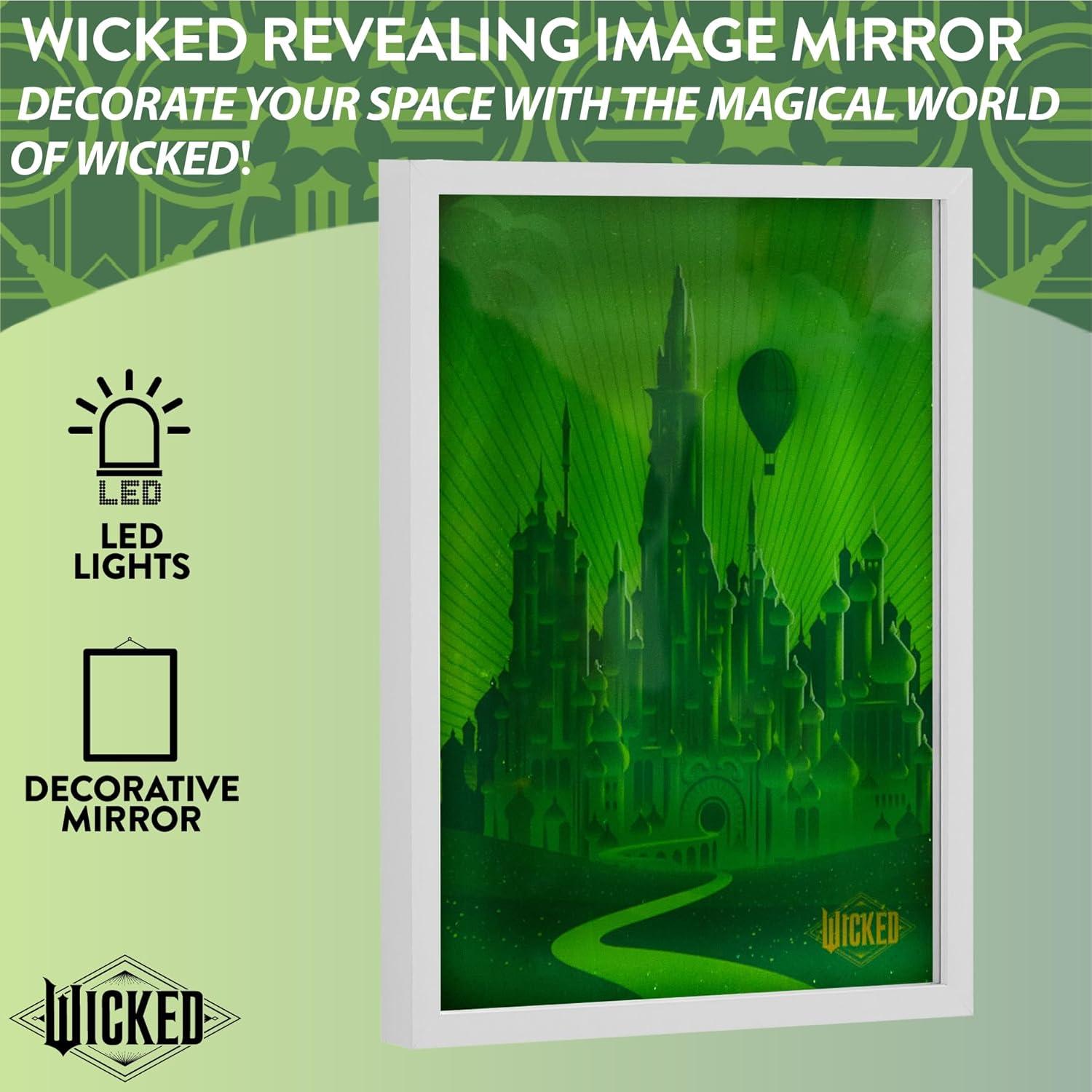 OFFICAL LICENSED DESIGN: When LED light is switched on, this Mirror features a dramatic green skyline of the Emerald City with radiant beams of light, a winding yellow-brick path, and the iconic hot air balloon, perfectly capturing the magic and mystery of Wicked. Inspired by the highly anticipated Wicked movie, this piece lets fans bring home the wonder and enchantment of the beloved story, making it a striking centerpiece for any room.
